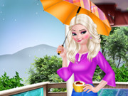 Elsa is a fashionista. She likes to try different fashion styles. Today is a rainy day, she thinks it is a good chance to create rainy fashion trends. Can you help her? Help her make-up in the room first, then puts on beautiful clothes, runs outside and feels the joy of the rain!